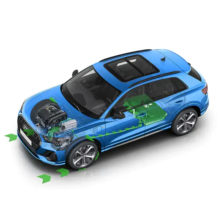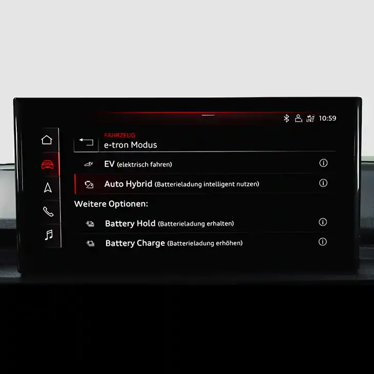 Los modelos híbridos enchufables combinan las ventajas de la electromovilidad y las tecnologías de propulsión clásicas. En Audi se denominan TFSI e. La incorporación es una clara indicación de que el vehículo se puede mover de dos maneras como híbrido enchufable. Para trayectos cortos se monta un propulsor eléctrico con una batería compacta y para trayectos largos un motor de combustión adicional. La distribución inteligente de energía cambia automáticamente entre los accionamientos según sea necesario para lograr la máxima eficiencia.